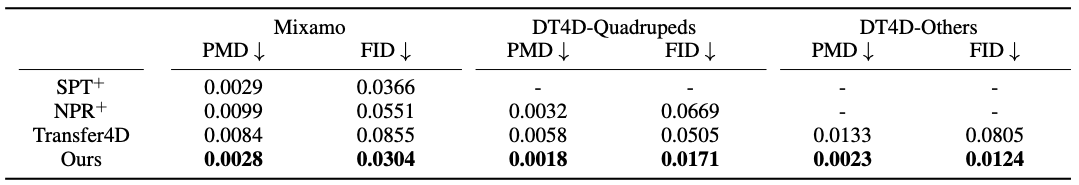 Quantitative comparison on Mixamo Humanoids and DeformingThings4D dataset.