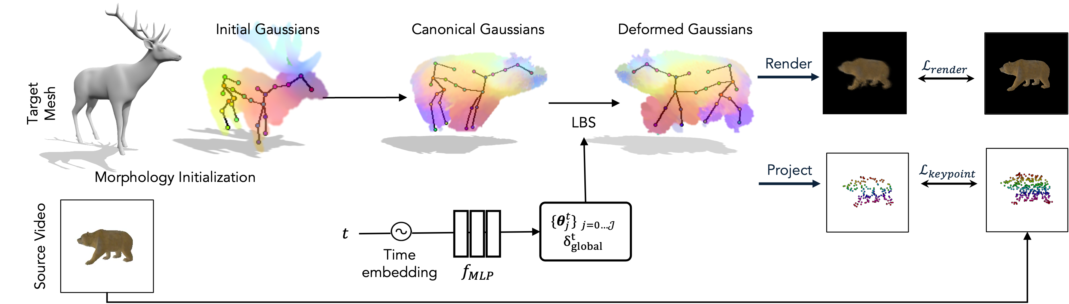 We first encapsulate the target mesh with an Articulated-GS (Yao et al., 2025) representation with pose parameters (Sec. 3.1). We then parameterize morphology using learnable bone lengths, a global scale, and local Gaussian offsets (Sec. 3.2). This representation disentangles shape variation from pose dynamics. Finally, all shape and pose parameters are optimized jointly via differentiable rendering and dense semantic correspondences (Sec. 3.3–3.4), yielding semantically coherent motion aligned to the source.